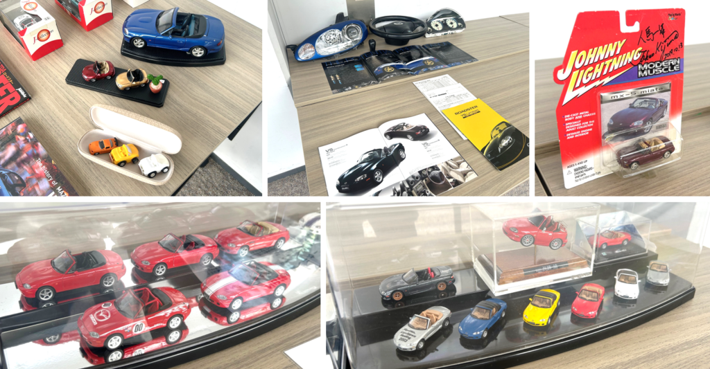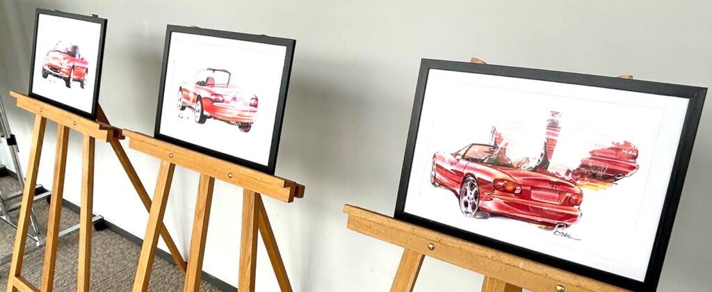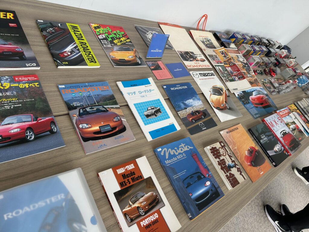 メインプログラムの待機時間に楽しんでいただくために、公式および、有志によるNBロードスターグッズの展示も行いました。こちらはマツダデザイナーさんによる、NBロードスターのデザイン画稿です。雑誌や書籍で見たことがあるやつだ!