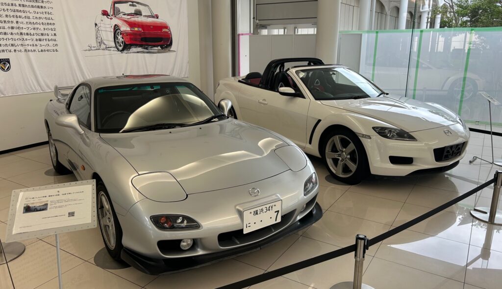 また、オープン仕様のRX-8は、広島カープなどのパレード用に制作されたワンオフモデルで、デザインは当時マツダE&Tで顧問をされていた福田成徳氏。同氏はユーノスロードスター時代にマツダデザイン本部長をされていた方で、NA/NBやFDのデザインテーマ「ときめきのデザイン」を熟成させ、かのロードスタークーペ(NB7)のデザインも手掛けています。つまり、ホールにはロードスターにゆかりのあるクルマが”偶然”用意されるという、ニクい演出がなされました。