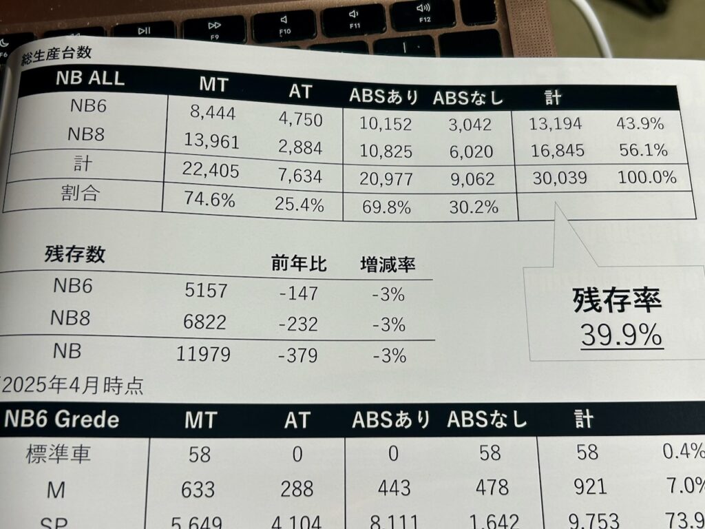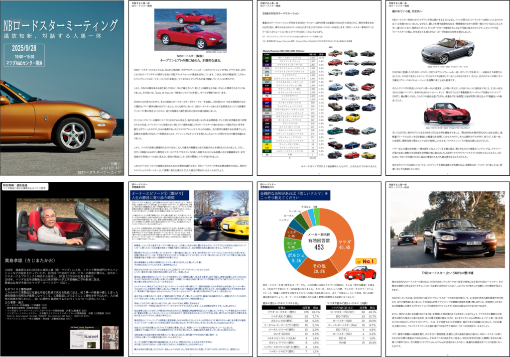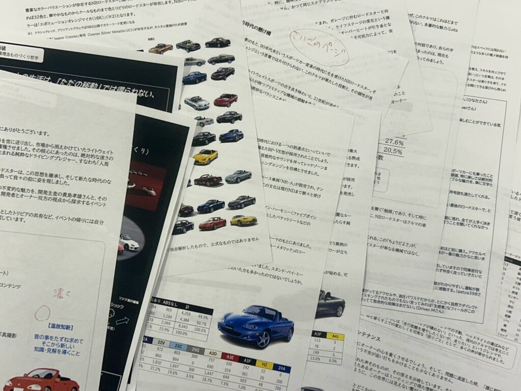 冊子からひとつだけ共有したいのは、NBロードスターの残存台数。2025年4月時点で国内生産分30,039台に対して、残存数11,979台(NB6:5,157/NB8:6,822)、残存率約39.9%ということです。20年前のスポーツカーではありながらも、約4割が生き残っているのはちょっと嬉しいですね!