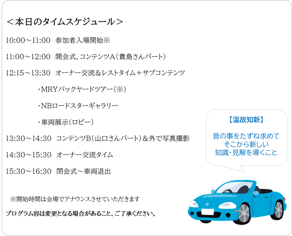 ・マツダの方や主催してくださった皆さんの負担が大きくなるので心苦しいですが、開催時間をもう少し長くして、皆さんとお話する時間をもう少し取れると良いかなと感じました。そのためにお手伝いスタッフを募集していただければ喜んで参加します。具体的な案を持っているわけではありませんがオーナー同士の交流のプログラムがあっても良いかもしれません。(Mさん)