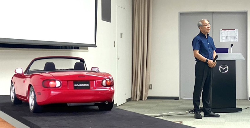 前半のプログラムは、現在山口東京理科大学の教授をされている貴島孝雄さん。多くのマツダスポーツカーに関わり、とりわけ歴代NA~NCロードスター、およびRX-7(FD)の開発主査もされていました。