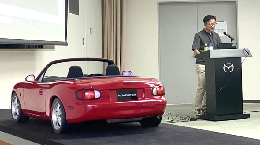 後半は、マツダ株式会社の商品開発本部にて、ロードスターヘリテージマネージャーをされている山口宗則さんに講演をいただきました。同氏はNA8ロードスターから現行のNDロードスターまで、文字通り全てのロードスターに携わっている、”生き字引”ともいえる伝道師のひとりです。NBロードスターはもちろん、そもそもの「ロードスターシリーズ」におけるモデルチェンジの考え方やその実現方法、競合他車との関係性など、開発現場のリアルを交えた多角的な視点での講演をいただきました。