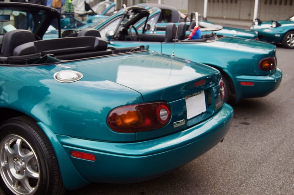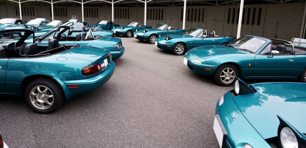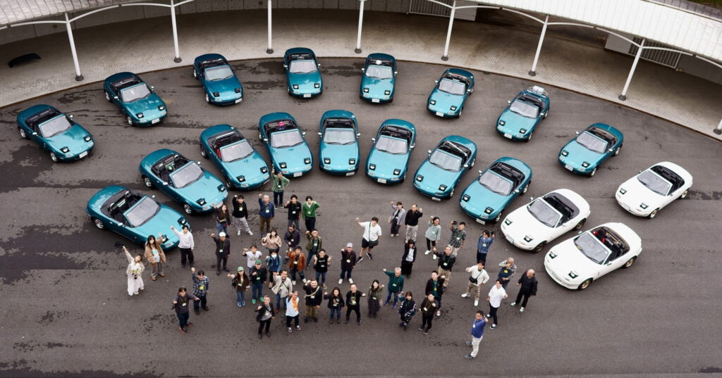 会場には1997年から四半世紀以上の時を超えたNAロードスターが、その特徴的なボディカラーを誇るかのように整然と並びました。鮮烈な緑色の「スパークルグリーンメタリック(11R)」と、クリーンな白色「シャストホワイト(PT)」が整列するキュートな光景は、奇跡とさえ思えるほどです。