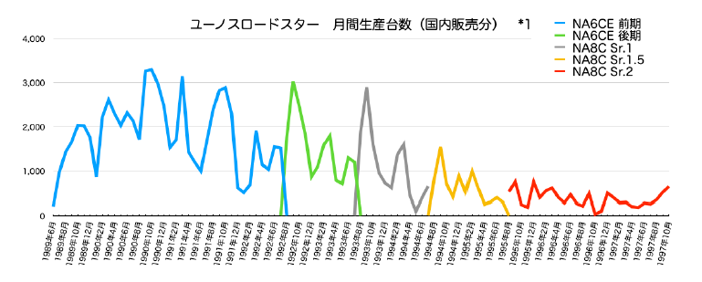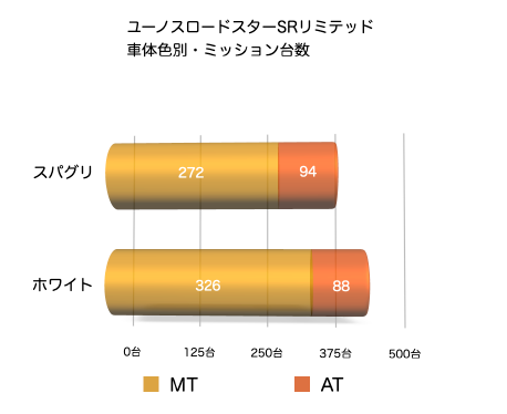 ここで主催資料を確認しますと、SRの生産期間は1997年8月1日から10月27日、しかしユーノスの最終生産日は1997年10月28日。お気づきのとおり、SRリミテッドの生産が終わった後に、最後の1日が残されていました。もちろん、SRリミテッドが生産されていた期間(1997/8/1〜10/28)も、通常モデルは並行生産されていました。その数、SRリミテッドが780台、に対して通常仕様が732台とほぼ半々だったようです。