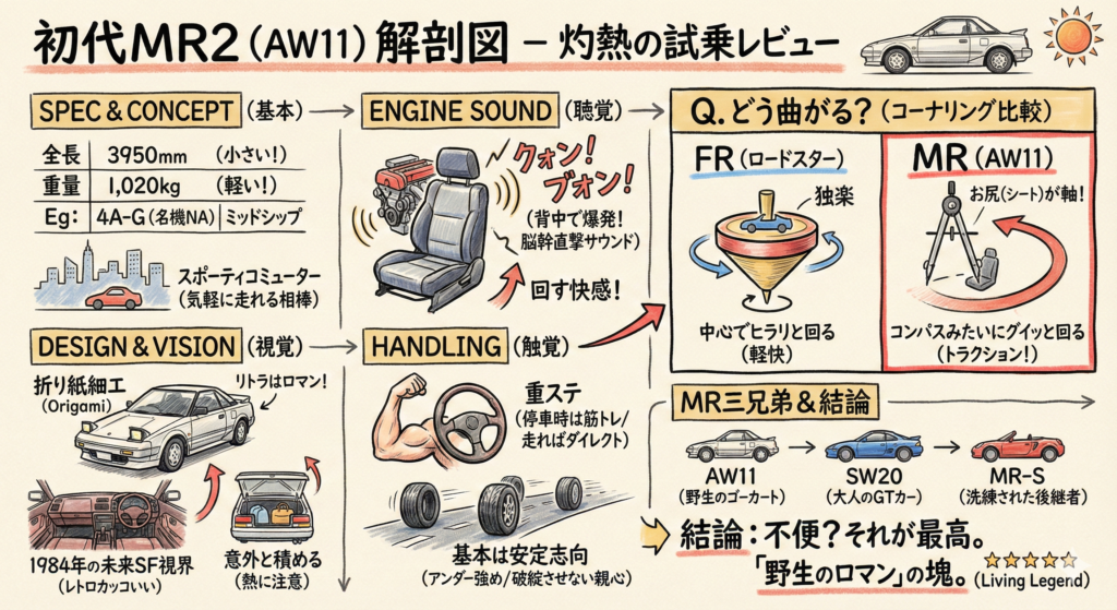 クルマにとってベストコンディションではなかった令和の真夏(灼熱地獄)、幸運なことに日本の自動車史における「生きた伝説」の一台といえるクルマのステアリングを握る機会を得ました。1989年式トヨタ「MR2(AW11)」。日本初の「市販ミッドシップ」としてセンセーショナルに登場した、かのライトウェイトスポーツカー(メーカー公称:スポーティコミューター/スポーティーパーソナルカー)です。