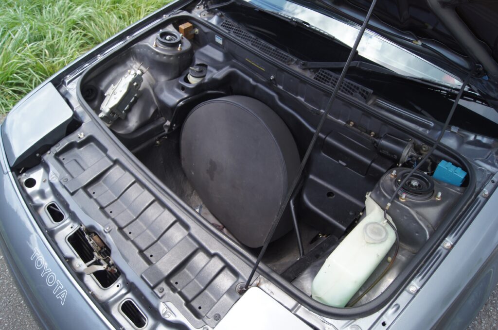 フロントフードの下はラゲッジスペースではなく、スペアタイヤが鎮座しています。重量物を中心の奥に低く配置するこだわりは、メカには手を抜かない(フュエルタンクのセンタートンネルレイアウトも含め)トヨタエンジニアの意地を感じました。お世辞にも荷物を入れるようには見えず、洗車グッズくらいなら行けるかな・・・