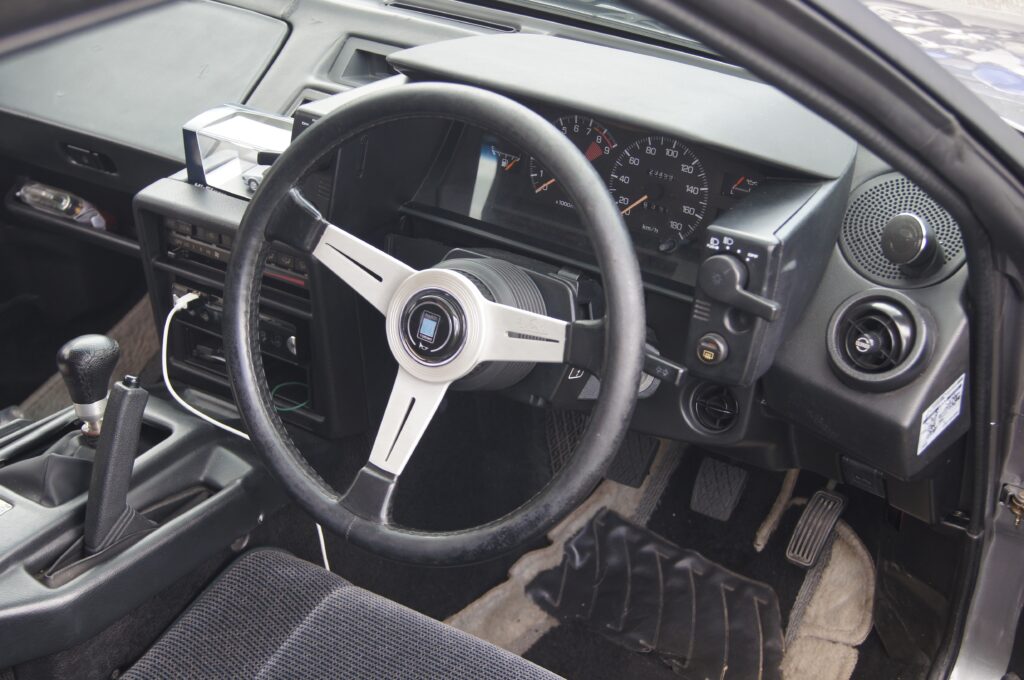 乗り込む前にざっと外観を眺めます。直線と平面で構成されたロー&ワイドで楔(くさび)形のフォルムは、まるで「折り紙細工」というか、ポリゴンっぽい印象をうけました。そのレトロカッコいい姿は今の世には懐かしく、そして珍しい・・・想定内ではありましたが、駐車場で振り返る方(とくにおじさん)が多くいました。ボディカラーはV型(最終型88年~89年)に設定されていたグレーメタリック【167】で、未来的なデザインを引き立てます。