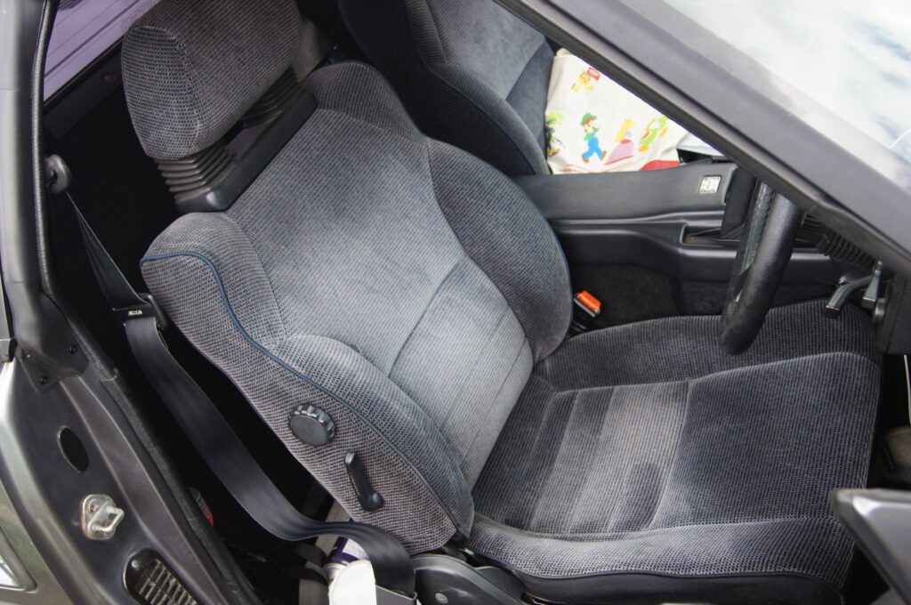 意外だったのは、純正シートの座高が高めだったこと。視線を上げるとフロントノーズがスッパリ落とされ、Aピラーも細いからなのか、かなり広い視界が確保されていました。ただし、2シーターなので座面は若干しか倒せませんし、ヘッドレストの蛇腹(じゃばら)デザインに時代を感じますが、シートの出来は悪くなく、腰のサポートも程よくありました。