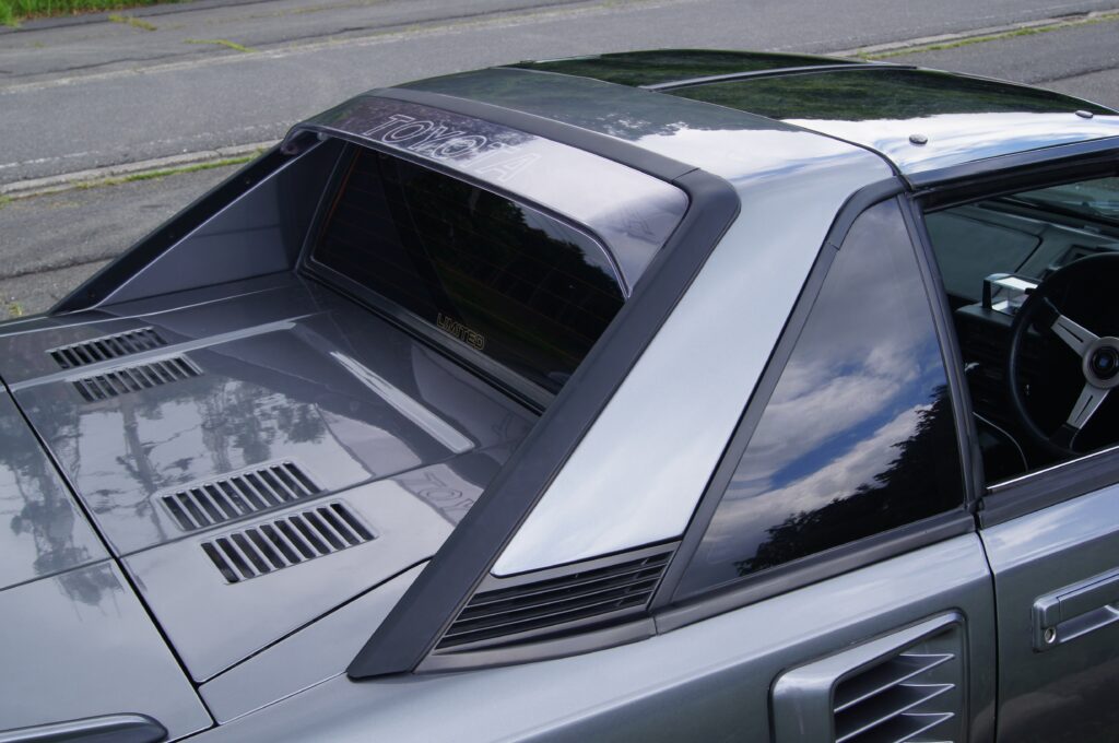 リアセクションは特徴的です。コーダトロンカ(リアエンドを垂直に近い角度でスパッと切り落としたデザイン)を活かしたパネル形状に配されたライト群、エンジンルームを回り込むトンネルバック(フライングバットレス)のCピラー、エグゾーストインシュレーター(マフラーのタイコ隠し)など、一目でミッドシップらしさが分かるデザインです。マッドフラップに描かれた「MR2」のロゴが一周回っておしゃれ!余談ですが、FRP製のウイングスポイラーは前期型では成型技術が追いつかず、木製だったそうです。