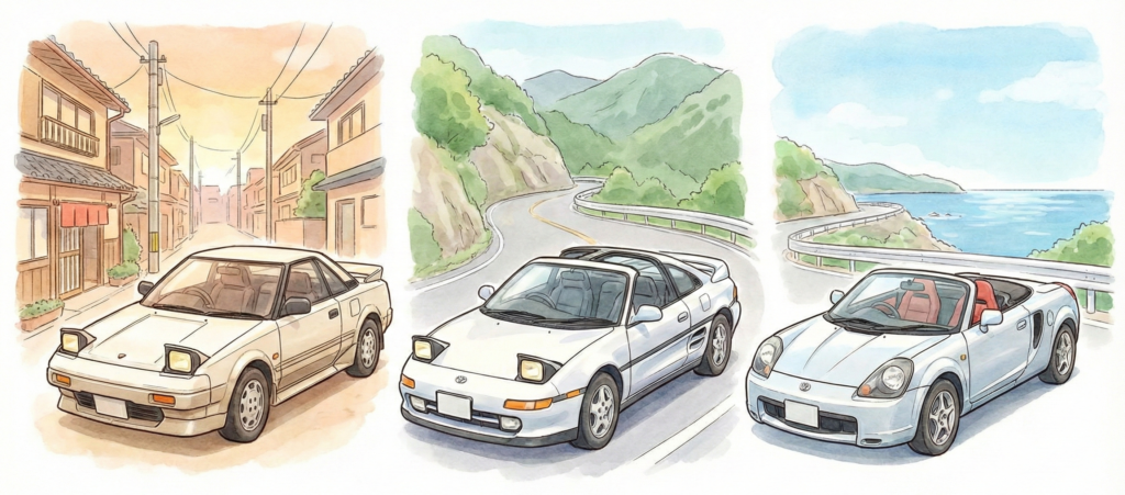 SW20(G-Limited)は、ある意味バブル時代の贅を活かした「GTカー」でした。滑らかな3S-GEエンジン、ストイックかつスポーティな内装、そして重厚な乗り味。AW11と比較すると、SW20は何もかもがスムーズで、静かで、パワフル。