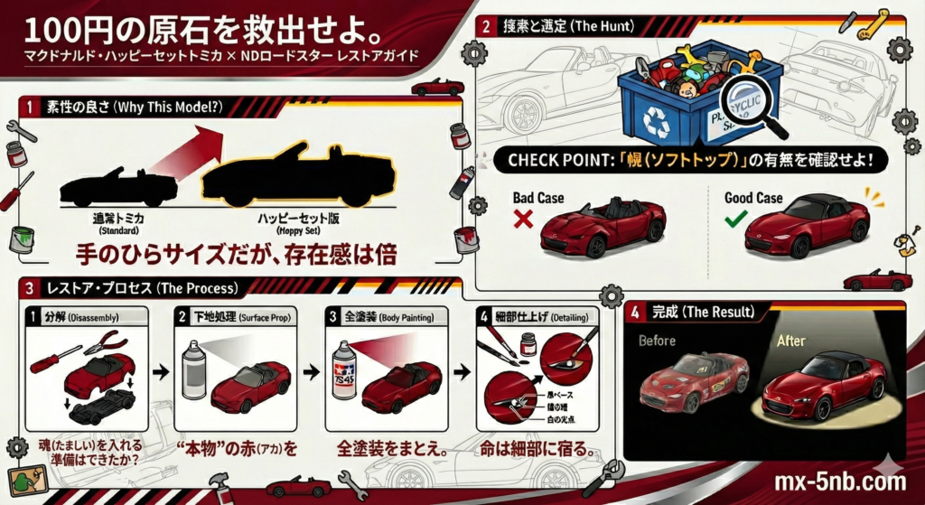 マクドナルドのハッピーセットにかつてラインナップされていたNDロードスター。手のひらサイズ(1/43)でとても可愛いのですが、リサイクルショップでは投げ売られていることが多く・・・折角なのでディテールアップをしてみました。弄っても楽しいロードスター!