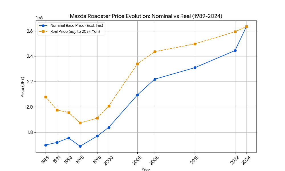 そこで今回は、1989年の初代NA誕生から2026年現在のNDに至るまで、「経済指標」と「ロードスター価格」の相関関係を検証してみました。ここで見えてきたのは、厳しいインフレの現実と、それを乗り越えようとした歴代モデルの奮闘です。