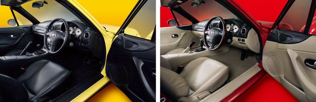 基本的なインテリアは、ベースとなるNB4と同一の仕様となり、各所にアルミ調パーツが架装されました。ベースモデル(クーペ/Type S)はファブリック内装、Type AはVSコンビネーションA相当のブラックレザー、Type EはVSコンビネーションB相当のベージュレザー&ウッド内装となります。ただし、固定ルーフとなったことからピラートリムやルーフライニング、その奥にあるインシュレーターは専用品となります。トランク容量は「高さ」が増したので容積自体は増えているのですが、諸元上はベースのNBロードスターと同じく144Lとなります。