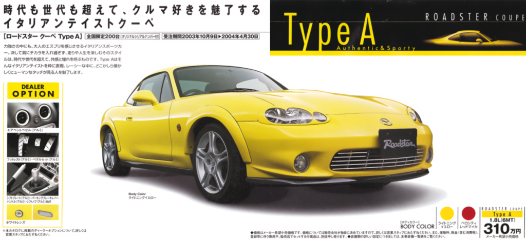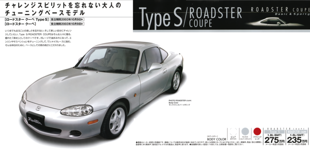 ベースとなる標準モデルです。フロントセクションはNBロードスターをベースに、ルーフからリアフェンダーにかけてクーペ用に新造されたエクステリアが見どころです。1600cc(NB6Cベース)モデルのグレードは「クーペ(Coupe)」、1800ccモデルは「Type S」というグレードになります。なお、Type SはRX-8とグレード名を合わせており、当時のマツダの「走りのトップグレード」を指しています。価格はCoupeが235万円(税抜)、Type Sが275万円(税抜)でした。
