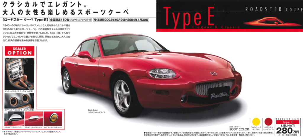 2002年にコンセプトカー「RSクーペ」として発表されたデザインをそのまま商品化した、クラシカルでエレガントなモデル。内装はベージュレザー&ウッド仕様となります。ベースモデルはNB8Cの4AT仕様で、ロードスターの歴史において唯一の【AT専用特装車】という極めて珍しい存在です。全国のオーナーの声から抽出された「ほっとする」「ヨーロッパの香り」というキーワードを具現化した、ネオノスタルジックデザインの完成形です。Eとはelegant(上品)を指します。価格は280万円(税抜)でした。