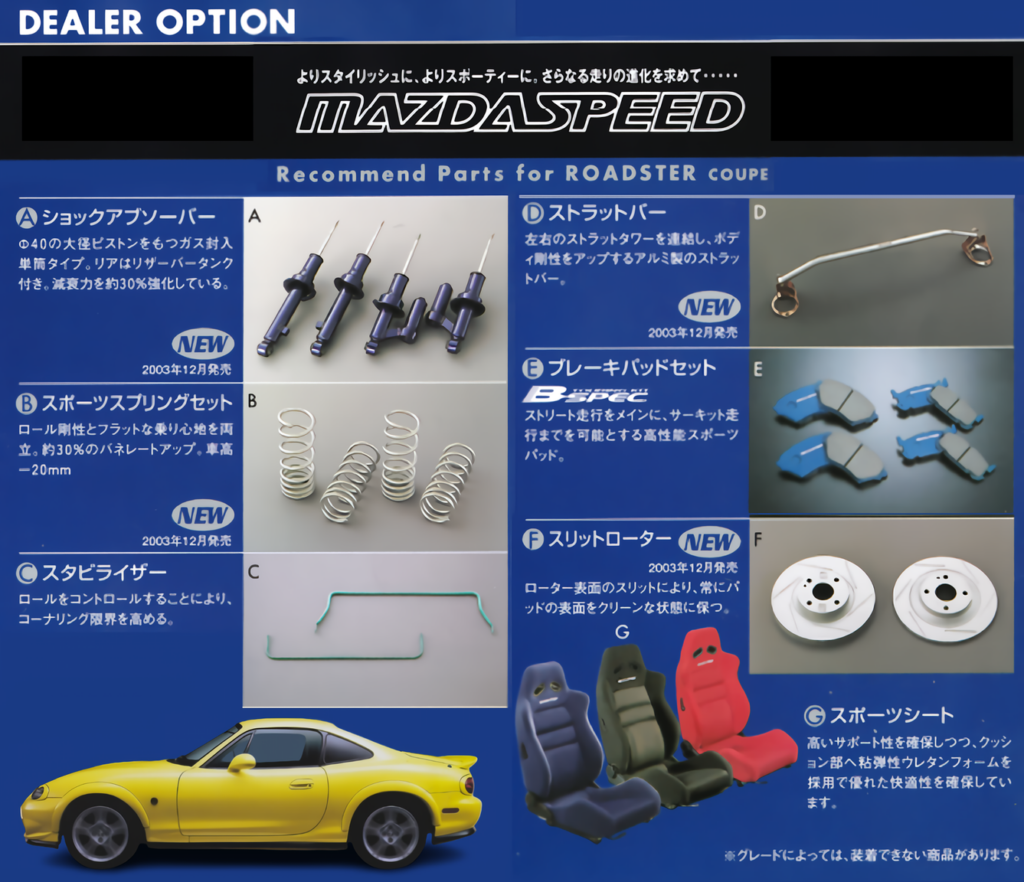 ショップオプションでマツダスピードブランドのパーツを架装することも可能です。なお、これらはクーペ専用品ではなく、NBロードスター後期型のカタログから選抜したものになります。余談ですが、NBロードスターはマツダスピード・スポーツスプリング(メーカー純正パーツ)にて車高を落とすことが可能でした。
