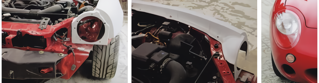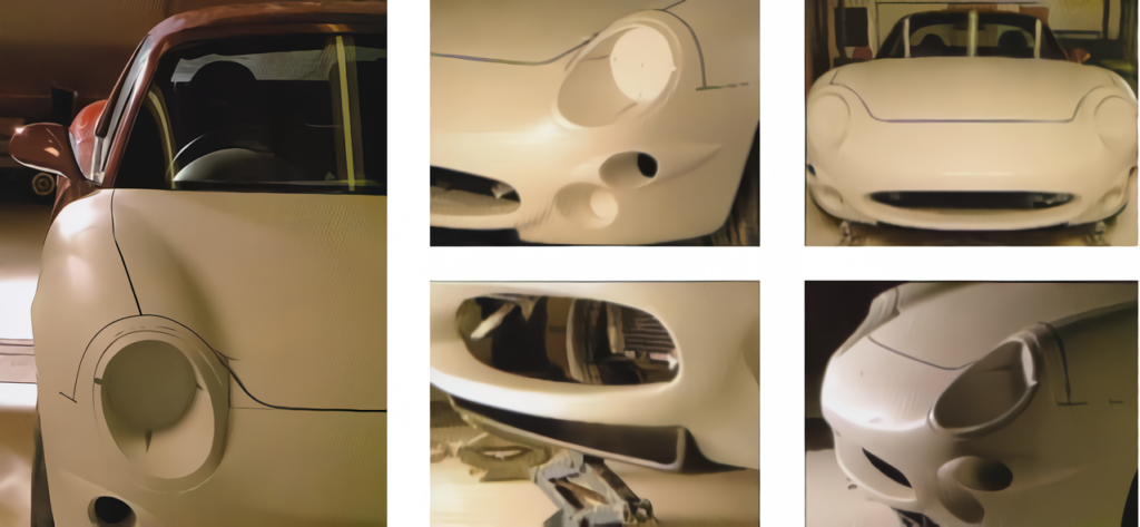最大の懸念であったフロントの内部構造(レインフォースメント)は「オーバーハングの金属部材を切削して短縮する」という、量産メーカーでは実施が難しい大胆な手法で対処しました。外装も高価な金型を作らず、コンセプトカーと同じFRP成型(ただし高品質なハンドレイアップ)のままで良しとしたのです。
