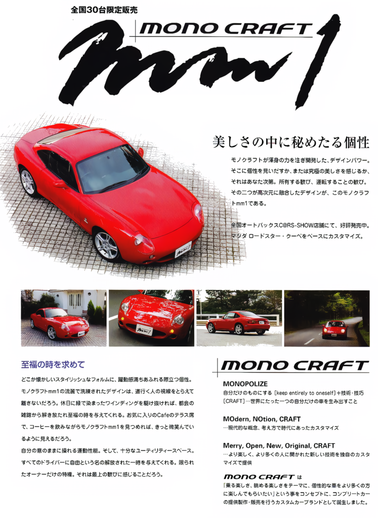 「monoCRAFT」は「乗る楽しさ、眺める楽しさをテーマに、個性的な車をより多くの方に楽しんでもらいたい」ということをコンセプトに、コンプリートカーの提供製作・販売を行うカスタムカーブランドとして誕生しました。
